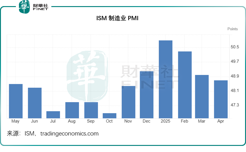 几天之前ISM公布的制造业PMI数据显示,4月份制造业PMI为48.7点,处于收缩水平,不过稍好于市场预期的48点,见下图。