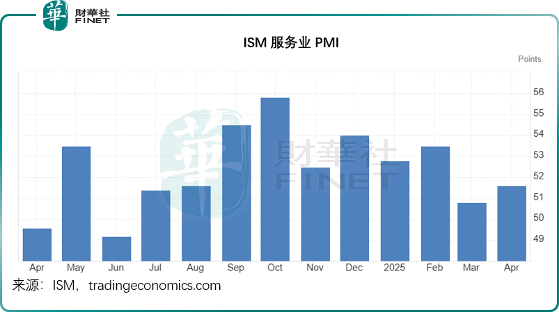 美国供应管理协会(ISM)最新公布的服务业PMI(采购经理指数)出乎意料上升,从3月时的九个月低位50.8点,上升至4月份的51.6点,远超市场预期的50.6点。该指数读数在50点以上,反映经济活动扩张,反之则意味着经济活动收缩。