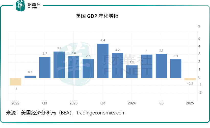 美国最新公布的2025年第1季GDP年化增幅为-0.3%,低于市场预期的0.3%增幅,为2022年第1季以来的首次下降,相较上季为增长2.4%。进口(在GDP构成中为减项)飙升41.3%是导致GDP增长放缓的主要原因,而进口之所以飙升,是因为特朗普的关税政策促使商家大量囤货,以应对成本飙升,这也反映出美国国内对于关税政策的担忧正在加剧。