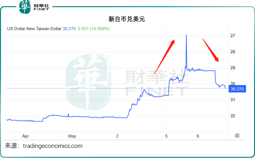 新台币兑美元也曾一度急涨,现已回落,见下图。