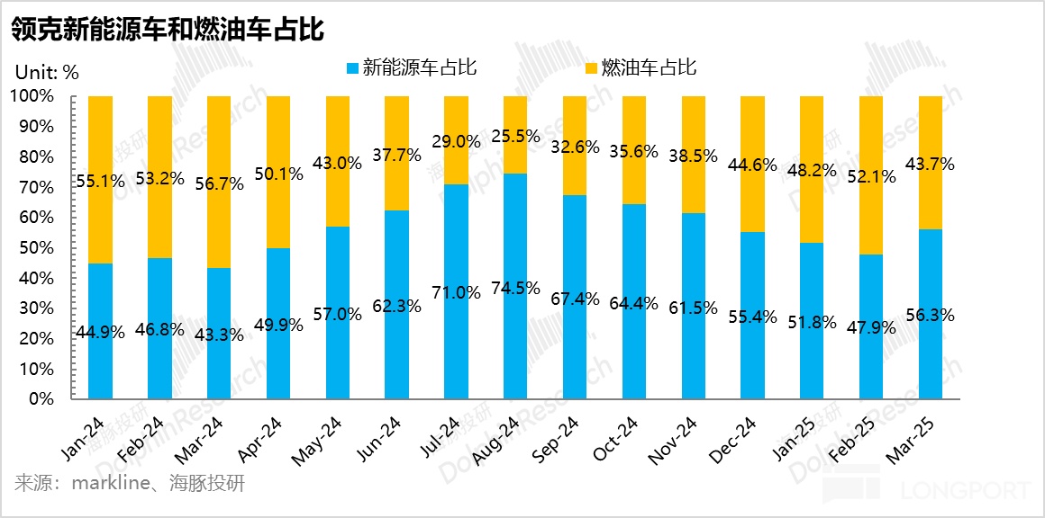 但实际上并没有按照规划来,领克仍然还在生产燃油车,且燃油车占比还挺高的(尤其是从收购的去年 12 月开始到今年 3 月,反而燃油车比例走到了 40%-50% 左右),很明显领克或者说吉利整体也并不像放弃燃油车这个目前还在源源不断产生现金流的业务,但其实对于整体极氪集团去打造新能源品牌标签是不利的,会出现消费者认知混乱,也会让投资者对极氪集团估值产生折价。