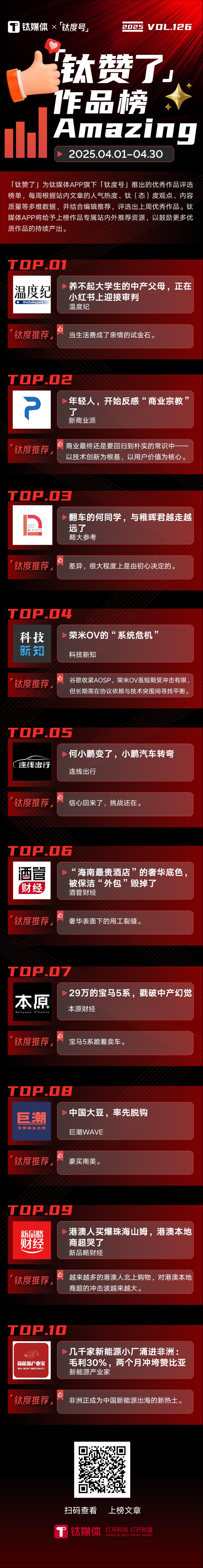 2025年4月1日—2025年4月30日,「钛赞了」榜单第126期上榜作品为: