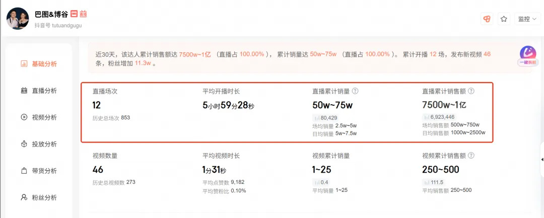 蝉妈妈数据也显示,近30天,巴图的账号“巴图&博谷”近30天累计直播12场,累计销售额达7500万-1亿元,累计销量达50-75万件,粉丝增加11.3万人。这一数据,比王逸宸30天超1000万的直播带货成绩远远高出一截。