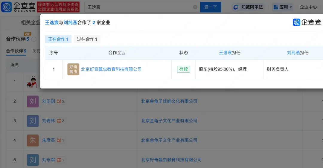 在直播间之外,母女二人的商业布局更是紧密相连。据企查查数据显示,王逸宸名下关联6家公司,3家为存续状态,公司名多跟金龟子有关,包括北京金龟子娃娃文化有限公司、北京金龟子文化产业有限公司等,其与母亲刘纯燕(金龟子)共同关联北京好奇瓢虫教育科技有限公司,王逸宸持股95%,刘纯燕担任财务负责人。