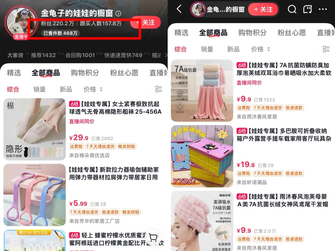 在橱窗选品上,王逸宸精准地指向了金龟子的粉丝群体,特别是90后的有娃家庭。截至发稿,“金龟子的娃娃”账号橱窗中共有144件好物,以生活日用品和母婴产品居多,平台数据显示,已售件数达到468万件。
