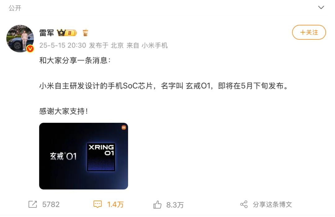 5月15日晚,雷军在微博发文称,“小米自主研发设计的手机SoC芯片,名字叫玄戒O1,即将在5月下旬发布。”