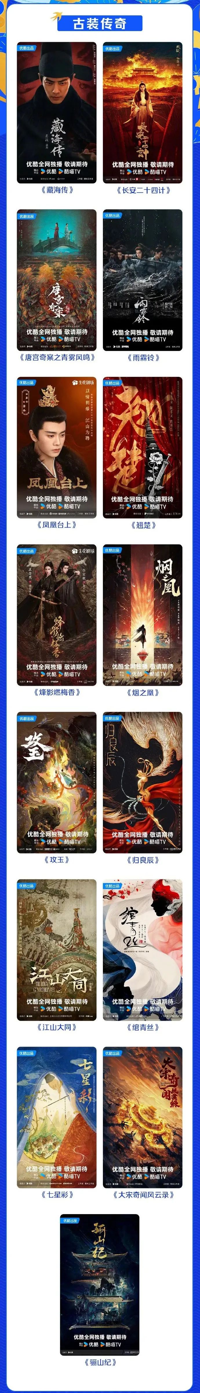 根据片单,优酷的大体量内容整体集中在“古装传奇”和“东方瑰丽”两大板块,而这两部分的内容都以古装剧居多。其中,男频和群像作品是平台着力布局的方向之一,除了已经播出的《藏海传》之外,《雨霖铃》《长安二十四计》等也是同类内容。