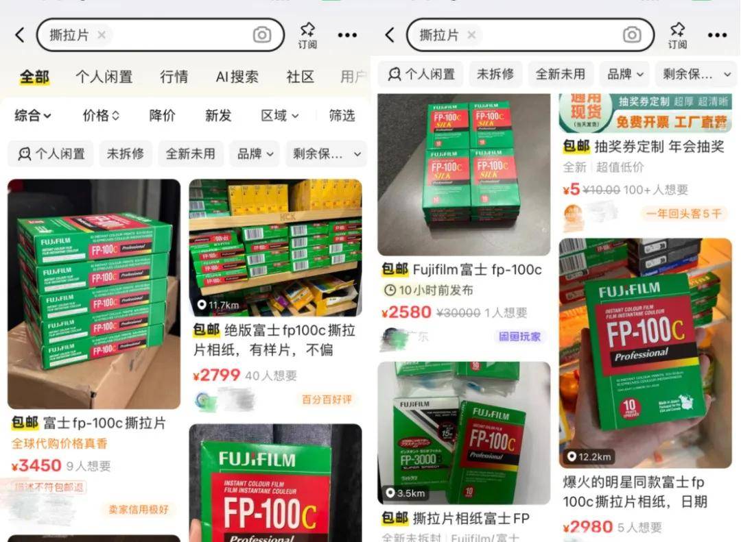 《天下网商》观察到,在闲鱼平台上,富士FP-100C彩色撕拉片相纸根据生产日期、批次差异,一盒10张装的撕拉片相纸的价格已经炒到2800元—3300元不等,几乎是相纸停产前售价的十几倍,涨幅超过黄金,被市场戏称为“纸片茅台”。在线下照相馆,根据相机类型、提供附加服务的不同,拍摄一张撕拉片的价格飙升至400-800元。