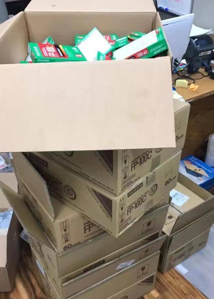 在相机店的仓库里,虞基笑称:“2019年囤的五六十盒撕拉片,现在只剩下十几盒了,有一部分被自己拍着玩掉了。”