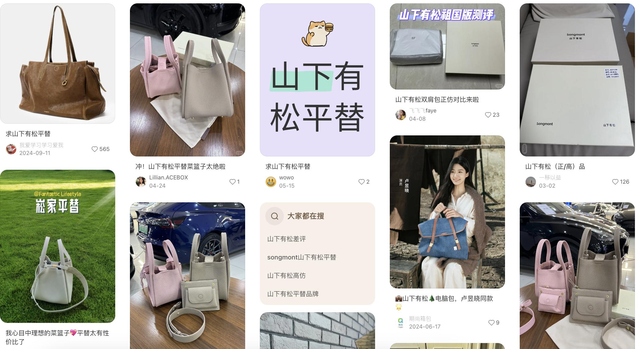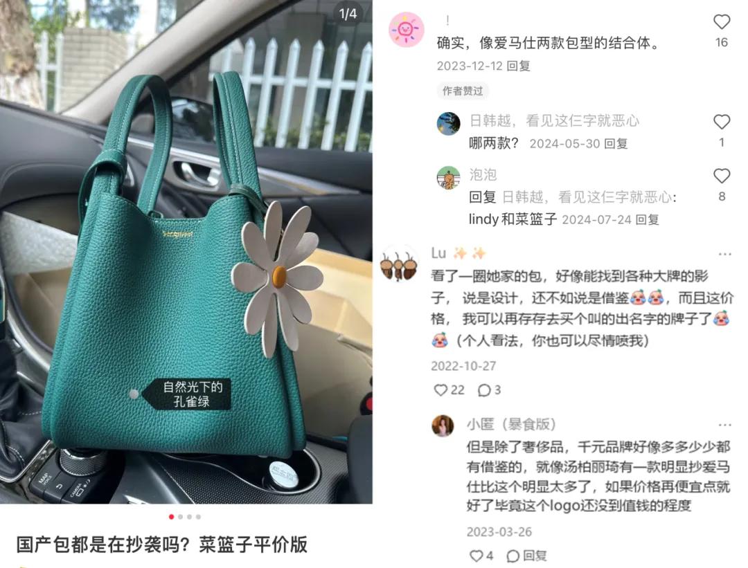 比如品牌爆品之一的菜篮子系列,在设计上被大众质疑是爱马仕Lindy和菜篮子两款的结合体,有网友留言,看了一圈山下有松的包,好像能找出各种大牌的影子。关于质量下滑、皮面瑕疵、五金掉色的评价也不在少数。