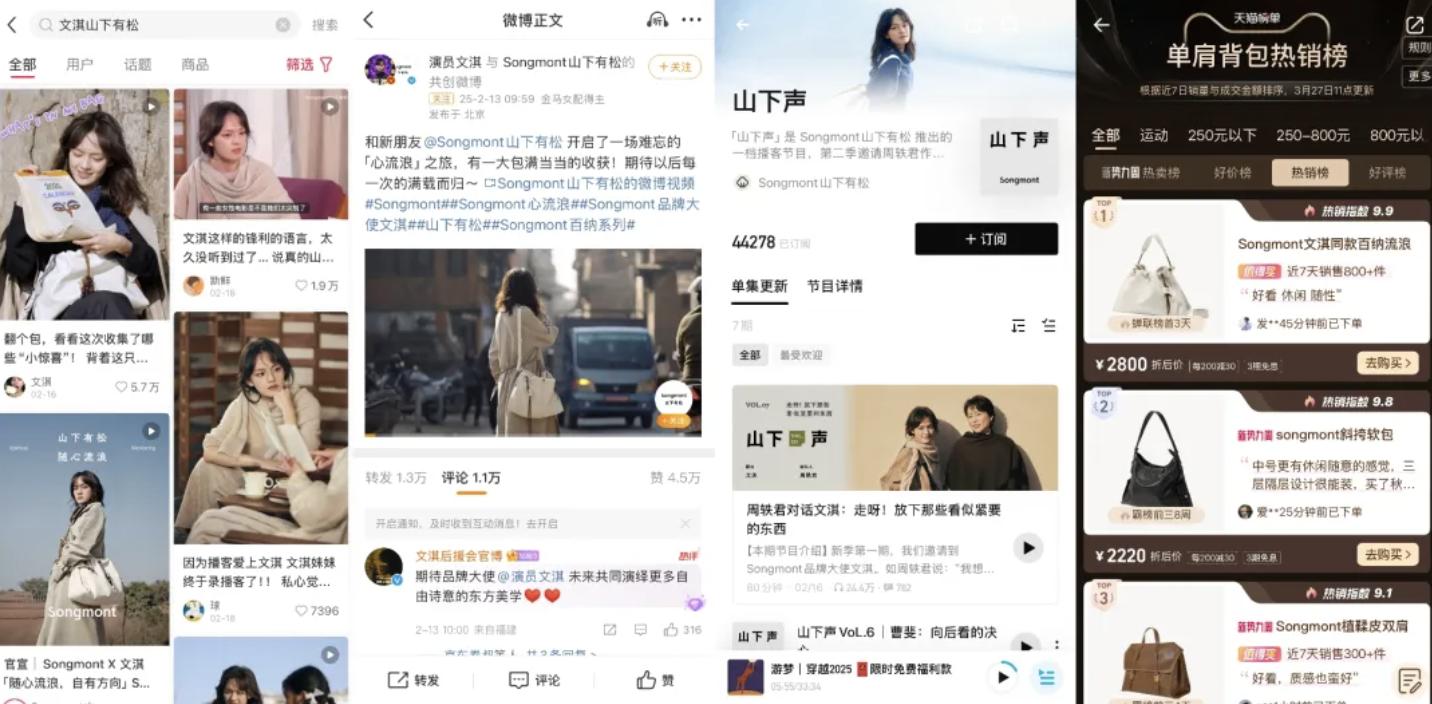 尤其是在邀请文淇作为品牌挚友后,品牌声量和好感度更上了一个台阶。社交媒体上有不少消费者提到是因为文淇才种草了山下有松的流浪包,“好看又随性”。