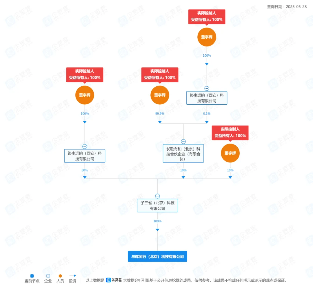 去年12月,董宇辉成立了4家公司,分别是终南远眺(西安)科技有限公司、长歌有和(北京)科技合伙企业(有限合伙)、子三省(北京)科技有限公司以及兰知春序(西安)科技有限公司。经营范围涉及投资、创业、旅游开发、票务代理、广播电视节目制作、演出经纪、文化艺术交流。企查查APP显示,董宇辉拥有上述公司绝对控股权。