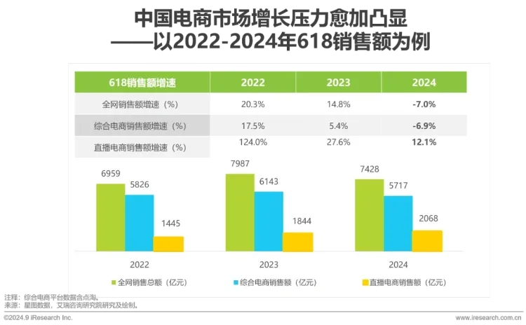 这也是董宇辉在今年618直播期间丢掉包袱、卖力上演“与商家谈判砍价”桥段的重要原因之一。据艾瑞咨询数据显示,近三年,直播电商“6·18”的销售额依然在保持逐年增长——2022年1445亿元、2023年1844亿元、2024年2068亿元。但同期,增速正在变缓,从2022年增速124%,下降到2024年增速仅为12.1%,呈现出逐年递减的趋势。