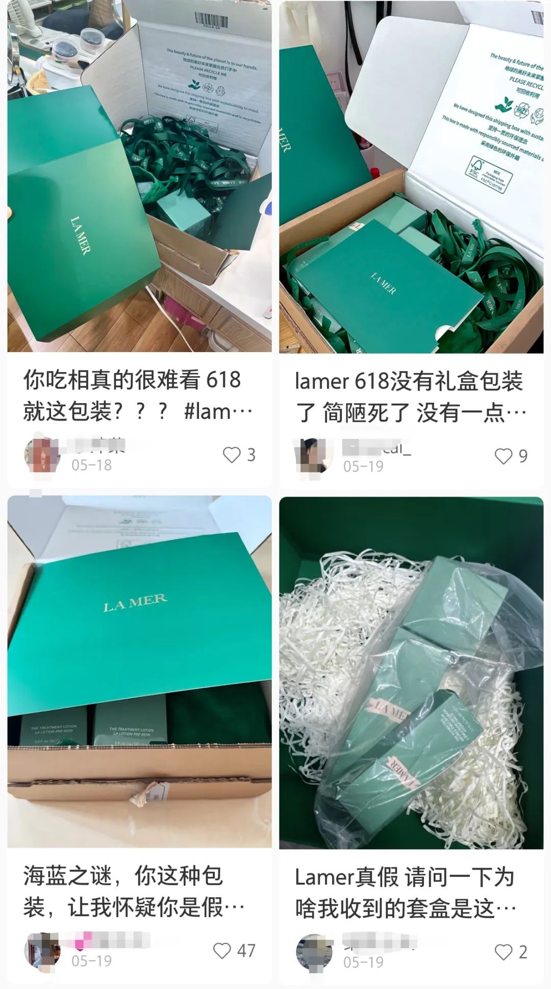 今年的618美妆激战中,顶奢类护肤品赫莲娜、海蓝之谜前后脚陷入了口碑争议。前者因官方旗舰店的价格设置BUG直接出现了王牌品黑绷带半价情况,而后官旗选择自动取消订单并给予红包赔偿;后者因不额外备注便默认用环保装发货包装,导致过于简陋、品控粗糙,而被不少用户质疑“失去品牌最重要的仪式感”。