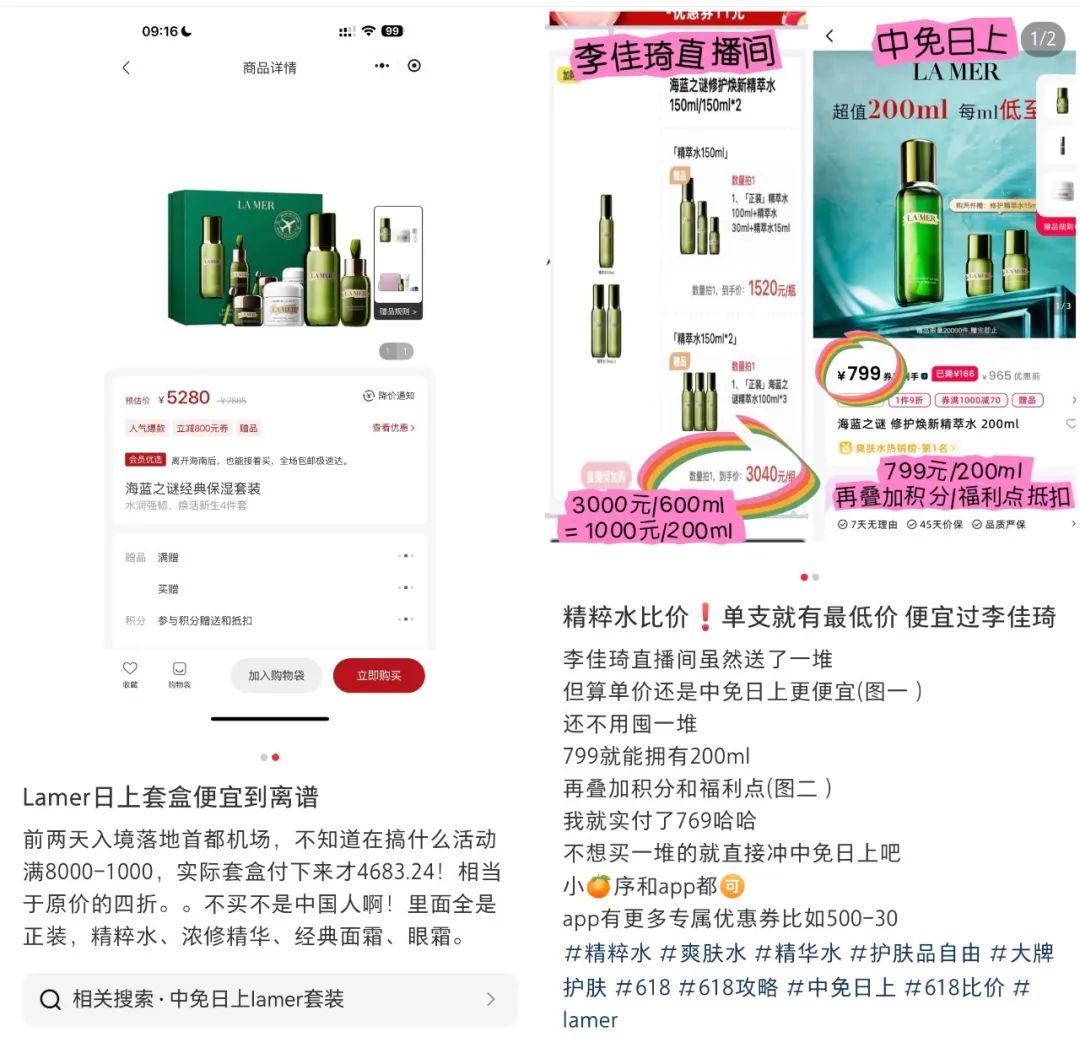 以海蓝之谜为例,去年618和双11大促期间,一度出现中免日上、海口免税渠道的同款产品比官方旗舰店乃至李佳琦直播间最低折扣还要优惠数百元的情况,线上线下的价格体系十分混乱,极大影响其高端美妆形象树立。