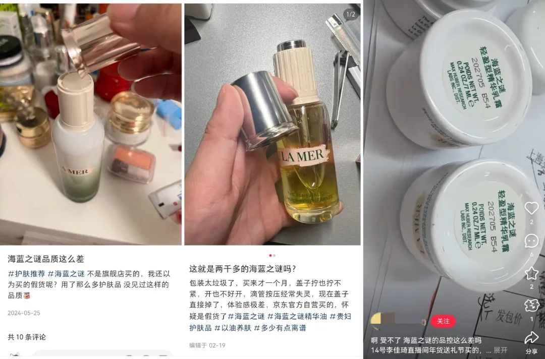 海蓝之谜的老用户SaSa表示,近两年她明显感觉海蓝之谜品控下滑严重。“精华乳吸管总会卡住脱落、精粹水外盖经常脱落。”在小红书搜索相关内容,可以发现大量吐槽帖。海蓝之谜面霜的瓶身印刷、内盖顶部发黄等问题均是重灾区。柜姐也告诉我们,之前因为盖子滑落的问题,她曾被客人直接线下质疑是否在销售假货。