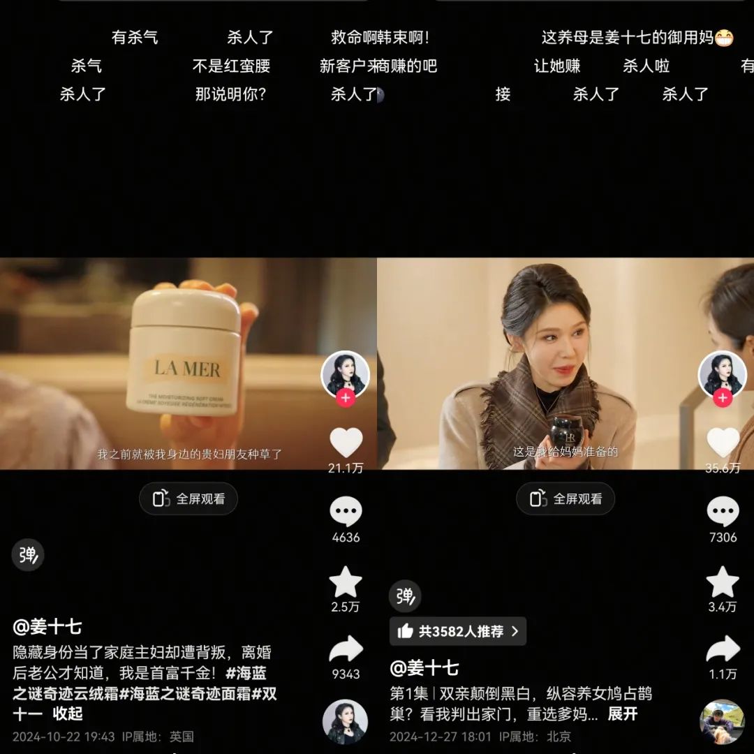 拓展中端消费者的方式放在了对“小镇贵妇”人群的开拓上。去年双11和年货节期间,海蓝之谜与赫莲娜先后与姜十七合作多部短剧,并与多位搞笑类、剧情类短视频博主推出广告内容,完成了在下沉市场的迅速突破。