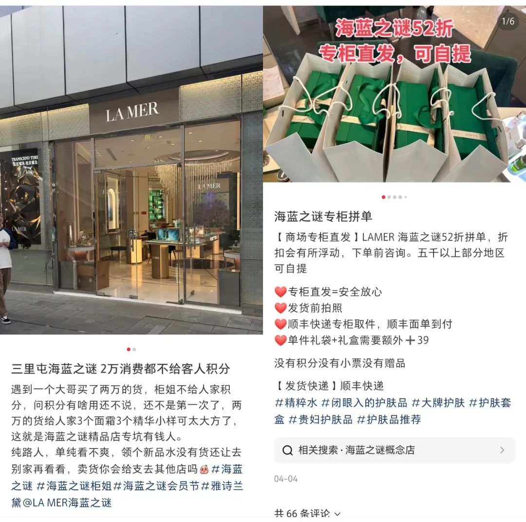 赫莲娜用户三水告诉我们,2023年前,她一直在线下专柜购买赫莲娜,但后来“明显感觉线下赠品条件变得苛刻,服务质量下滑”,改在线上渠道购买,但“去年双11期间官方旗舰店购入的产品是旧货,有效期只有一年半,这样当然也不敢再囤货了。”