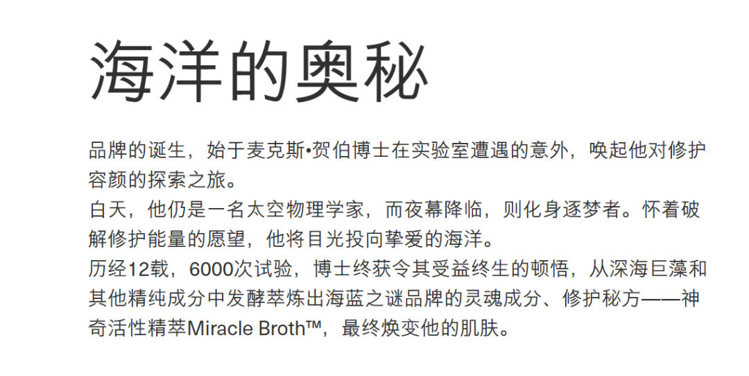 典型例如海蓝之谜,作为主打修护的品牌,其创始故事曾作为品牌传播重点:太空物理学家在实验事故中被严重灼伤,然后发明这款面霜实现修护,其中最核心的成分“神奇活性精粹”中含有深海巨藻提取物,在低温发酵过程中更是经历了播放古典音乐等“玄学操作”,最终创造出了独家秘方。