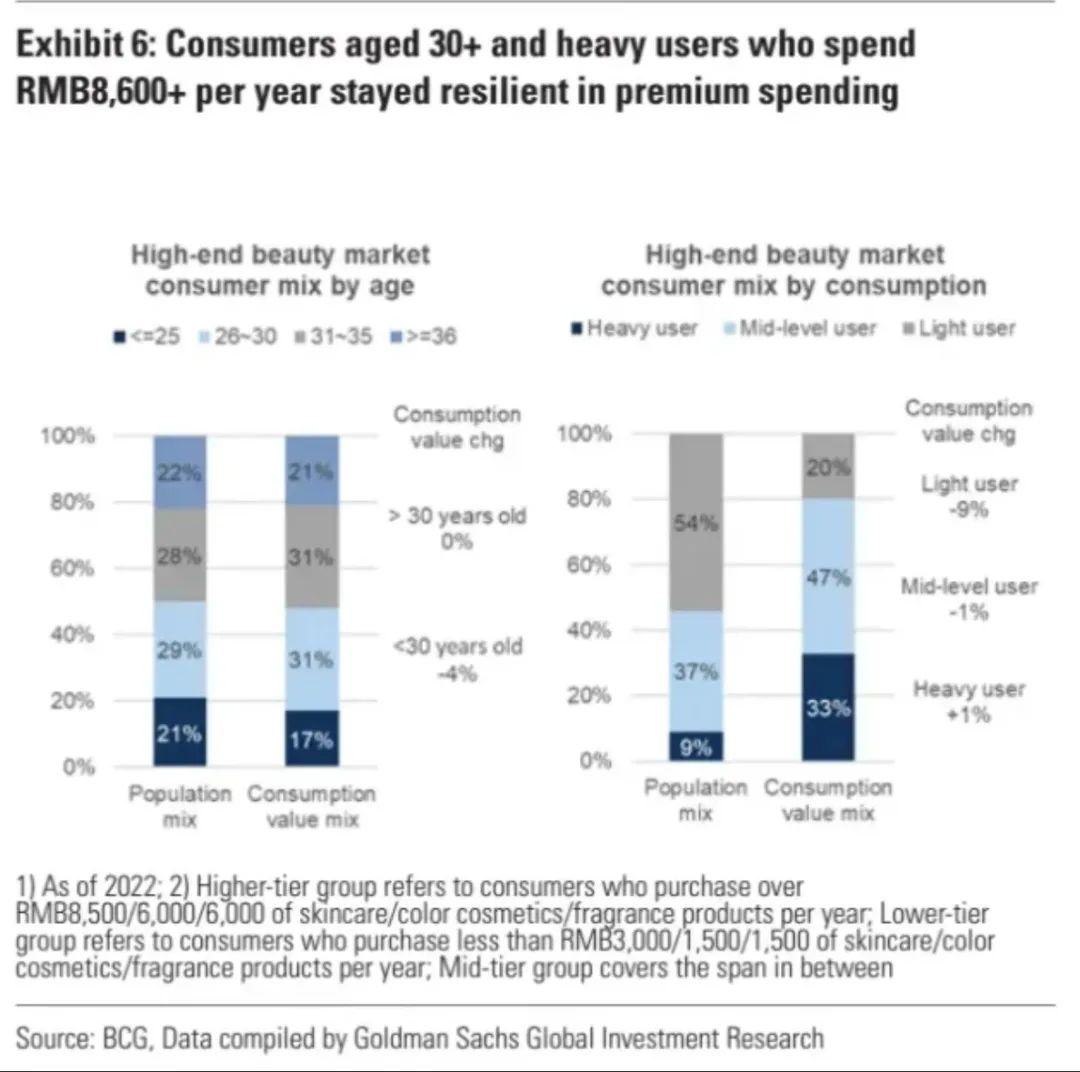 高盛研究曾将高端美妆的消费人群分为入门级用户、中端消费者和高价值人群,分别对应年均护肤品消费低于3000元、在3000-8500元区间和8500元以上的用户。