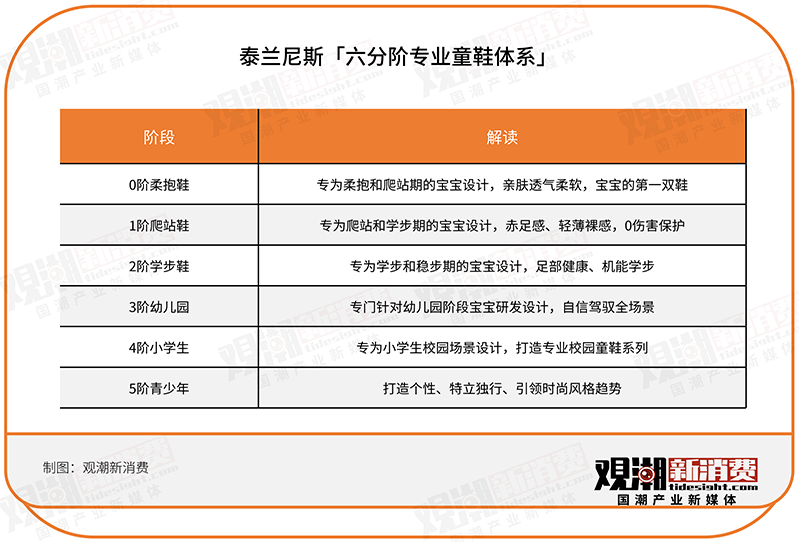 针对这些问题,泰兰尼斯综合婴童感知力发育、成长生理特征、场景使用习惯三个维度,给出了自己的解决方案——“六分阶专业童鞋体系”。简单来说就是,把儿童成长分为柔抱、爬站、学步、幼儿园、小学、青少年6个阶段,以阶段为标尺设计产品。