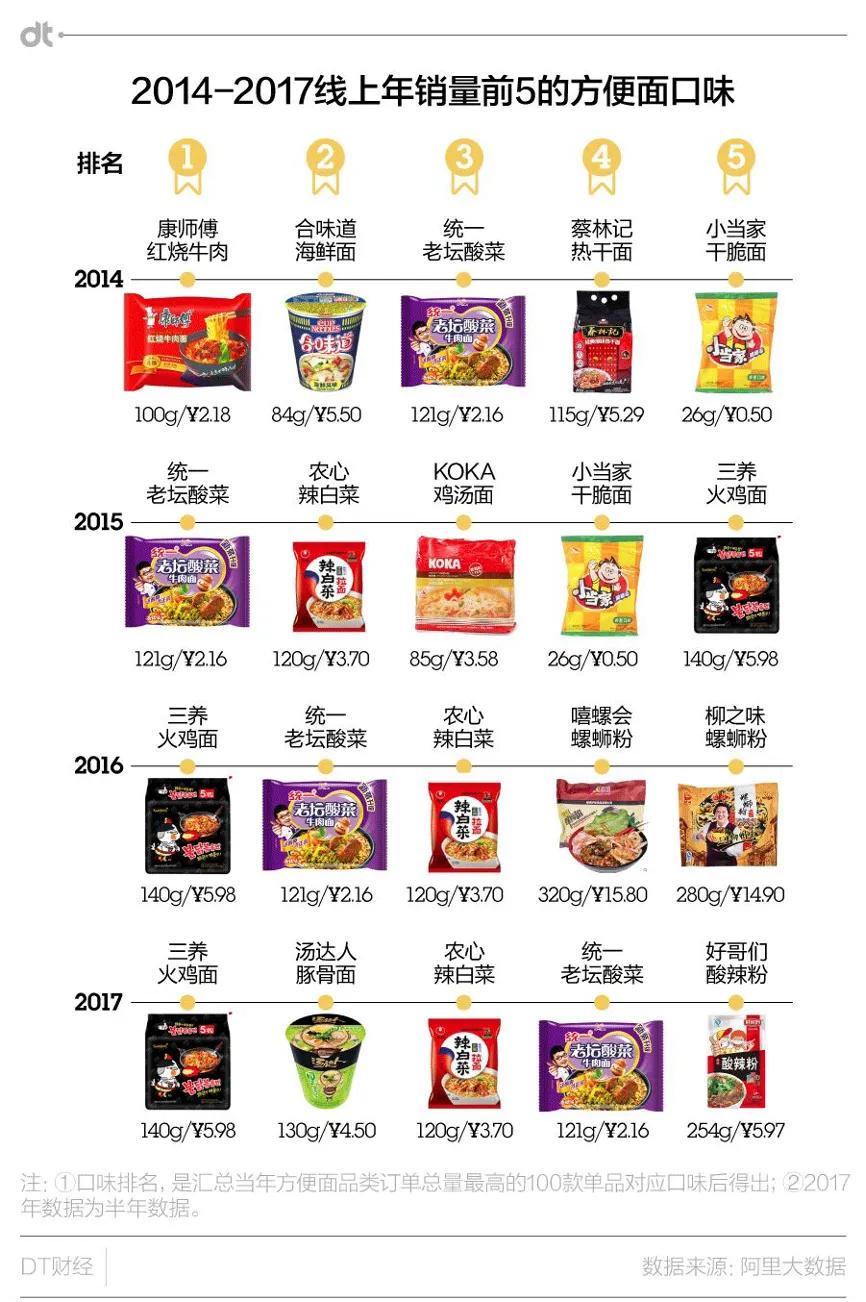 根据一份2017年前后DT财经发布的市场销量前5方便面数据,可以看到主流的方便面含量均为整包120克左右。