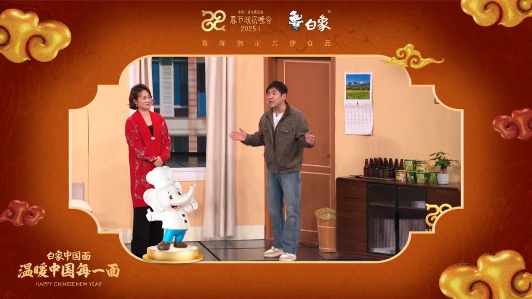 围绕春晚,白象策划了一系列完整的营销矩阵。与央视新闻在《春晚专列——温暖每一面》特别节目中为归家游子送上暖心的白象 0+饺子和白象高汤面;晚会现场,从主持人送祝福到小品《小明一家》中的童年回忆,直至沈腾小品中的关键道具......
