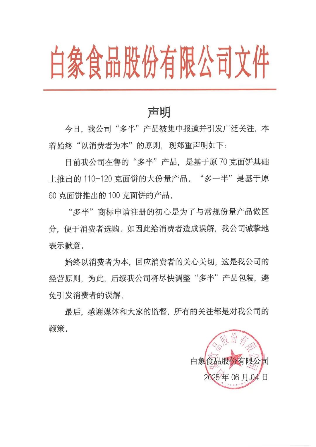 事态发酵一天后,白象发出道歉声明:目前公司在售的“多半”产品,是基于原70克面饼基础上推出的110-120克面饼的大份量产品。“多一半”是基于原60克面饼推出的100克面饼的产品。“多半”商标申请注册的初心是为了与常规份量产品做区分,便于消费者选购。