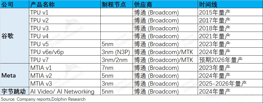 由于谷歌贡献了当前 AI 业务绝大部分的收入,因而谷歌 TPUv7 的情况也是市场关注的。虽然博通 AVGO 也遭遇了联发科的竞争,但对谷歌 TPUv7 的单子担忧不大。结合行业面情况,海豚君预期谷歌的 TPU v7 仍会推出 v7p 和 v7e 两个版本。其中 v7p 仍交由博通设计,v7e 版本则由 Google 团队设计 ASIC die,搭配联发科 I/O 解决方案。虽然谷歌连同联发科做了 e 系列的产品,但核心 p 系列的产品仍全部交给博通。
