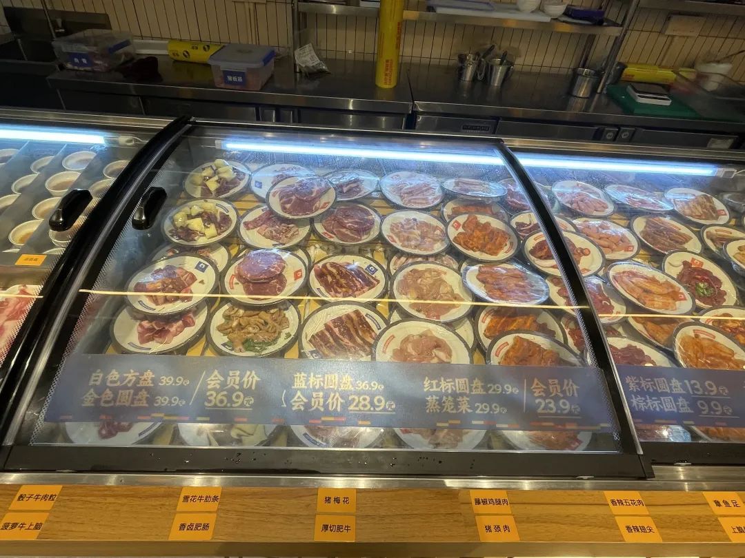 也有一些连锁品牌引入了近两年较火的半自助模式,例如坡摊烤肉将超50种食材按品类陈列在冰柜中,以4.9元、9.9元、13.9元等六个价位区分,用不同的餐碟标识,消费者自由拿取。