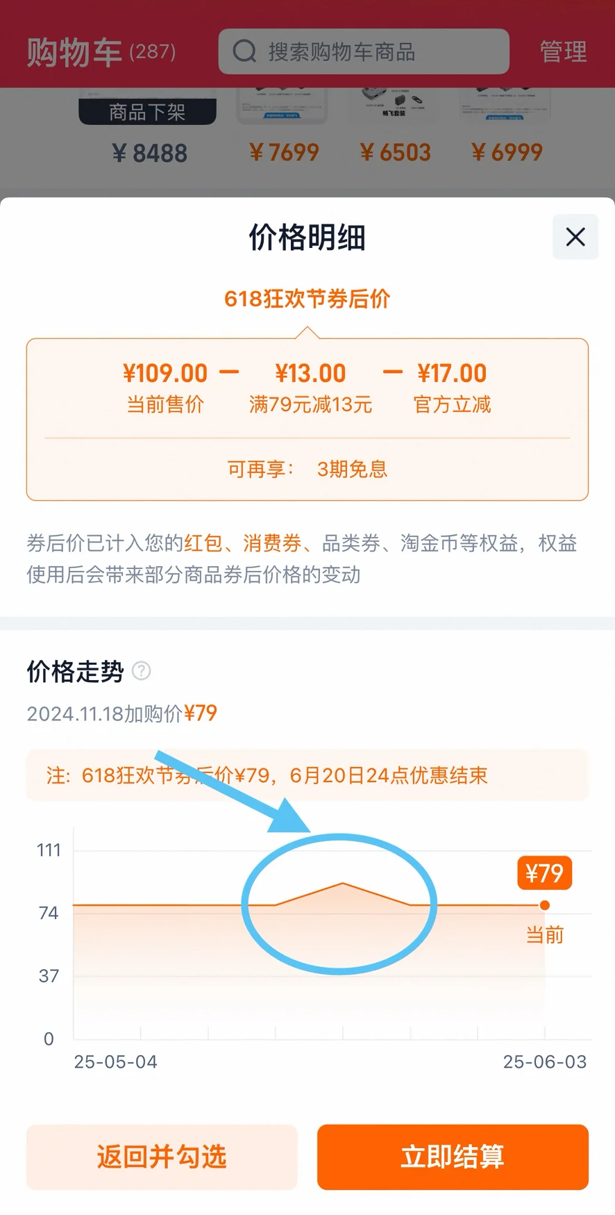 熊丽丽之前在购物车里加购了一份89元的头饰,进入618后价格变成109元,她便下载了比价工具查看历史报价,结果清晰显示在大促来之前有一次提价,最终跟大促前比并没有优惠。
