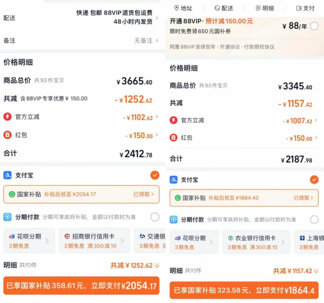 淘天在官方立减8.5折的基础上可以叠加消费券、行业品券和直播间红包等优惠,每晚8点准时放券,如果是88vip会员的话,可以用88积分兑换多张专属优惠券,总额为800元,此外还有88vip专属的国补消费券,捡便宜纯考验运气和手速。