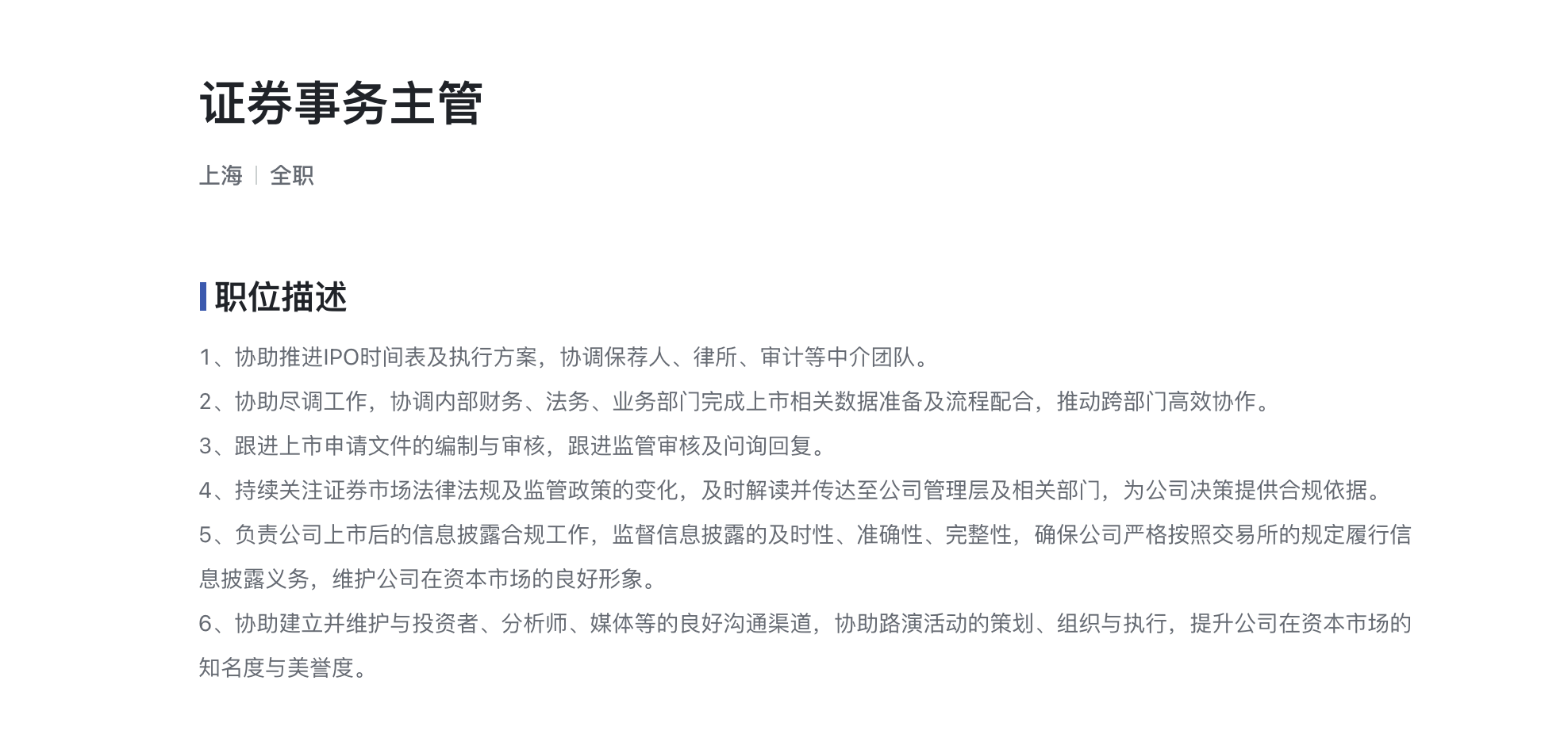 据智元机器人在Boss直聘上发布的“证券事务主管”岗位显示,其需协助推进IPO时间表及执行方案,协调保荐人、律所、审计等中介团队;跟进上市申请文件的编制与审核,跟进监管审核及问询回复;负责公司上市后的信息披露合规工作等。