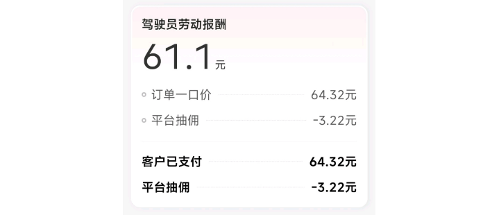 雷林就向我们展示了他的订单截图,相比于64.32元的价格,抽佣3.22元确实低到了不足5%,远低于市面上任何一个网约车平台。据他所述,64.32元的价格,算上接驾的距离,小拉每公里的抽佣价格,折合下来甚至不到1元,是低于其他平台给出价格的。