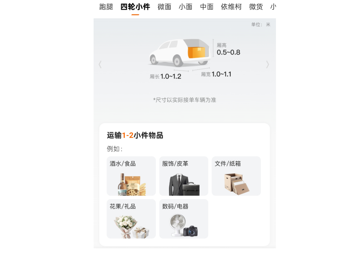 打开货拉拉的下单页,除了拉货、搬家这种需要用到空间较大的面包车、货车之外,在跑腿选项中是有一个名为“四轮小件”的可选服务的,其主要运输的产品包括食品、服饰、文件、礼品、小型数码电器等小件,而提供这项服务的正是小拉出行。