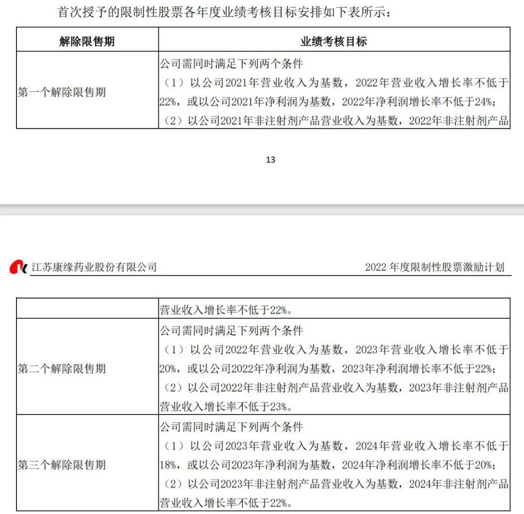 2022年,公司定下了限制性股票激励计划。考核年度为2022年至2024年三个会计年度,除全年营收、归母净利率增长率考核目标外,还设置了非注射剂产品营收增长率的考核目标。