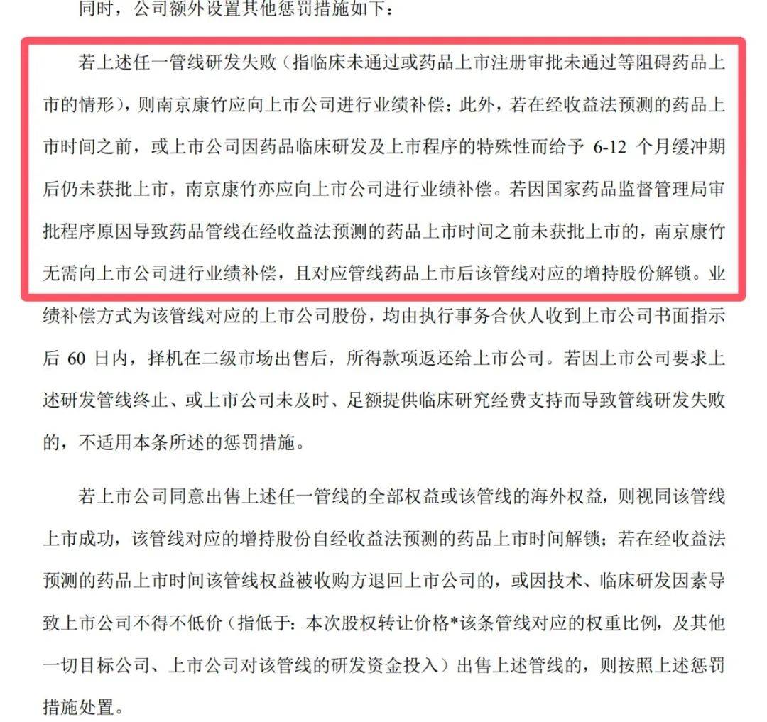 而南京康竹转让30%股权获得对应的0.81亿元转让款,虽为一次性支付,但需将税后资金用于增持康缘药业股份并锁定,且设置了明确业绩对赌:若管线因临床未通过、上市审批未通过等原因而研发失败,或未在预测上市时间(含6-12个月缓冲期)获批,南京康竹需向上市公司进行业绩补偿。