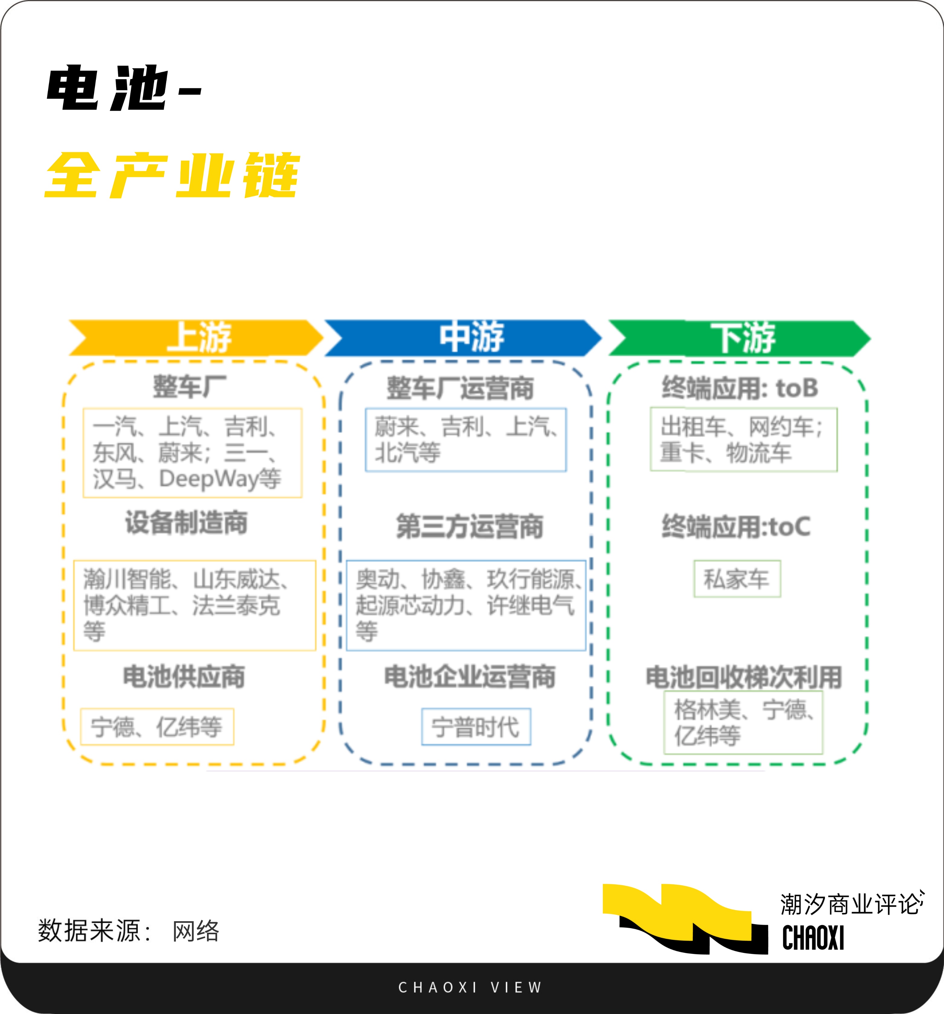 产业端,该模式需要打通上游(整车等)、中游(运营商)、下游(基础设备等),进而实现商业的完整闭环,这就不难解释为何宁德时代要与蔚来合作了,纵观业内,在技术上有后发优势,在应用上有前期经验的,几乎只有这2家。