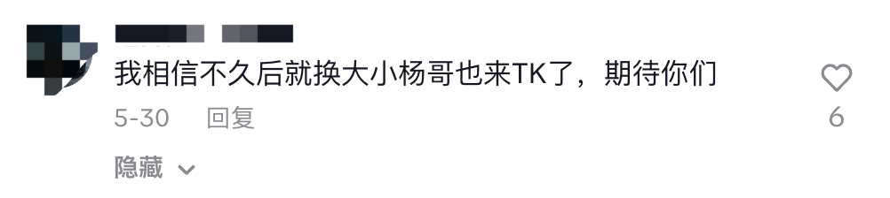 “我相信不久后就换大小杨哥也来TK了,期待你们” ,在coco账号的一则与小黄合拍的视频评论区中,有网友提到。