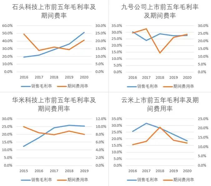 以下图为例,四家典型的小米IoT生态链企业,在上市初期,期间费用率并不会出现明显的摊薄效应,侧面印证了小米打造爆品需要快速迭代,维持投入的逻辑。