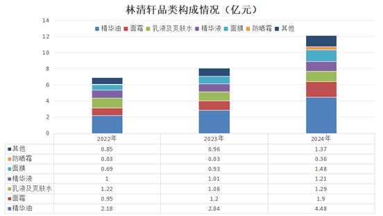 其中,精华油是贡献收入和增长的核心品类,24年卖出4.48亿元,贡献了37%的营收。