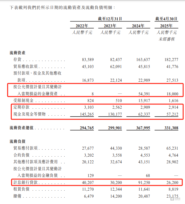 其中偿债与补流举措格外引发关注。据悉,截至2022年末、2023年末、2024年末、2025年4月末,卧安机器人的现金及现金等价物分别为14526.5万元、13017.7万元、6233.7万元、5721.2万元,流动负债中的计息银行借款分别为4020.7万元、3020万元、9125万元、2620万元,可见,现金及现金等价物长期远高于计息银行借款。需要说明的是,虽然2023年公司现金及等价物低于计息银行借款,但该年公司账面上拥有5439.1万元金融资产,这两项资产相加之后也高于同期的计息银行借款。