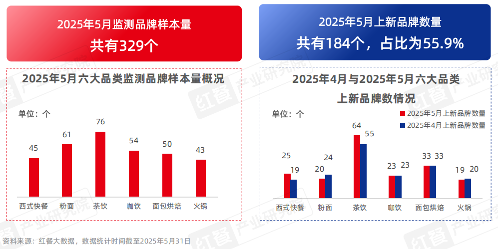 为洞悉餐饮行业产品上新发展趋势,红餐产业研究院选取了餐饮行业具有代表性的六个品类作为监测对象,包括西式快餐、粉面、茶饮、咖饮、面包烘焙、火锅这六大品类。在2025年5月,红餐产业研究院监测的六大品类的品牌样本量一共有329个,总计有184个品牌推出新品,占监测品牌样本量的55.9%。