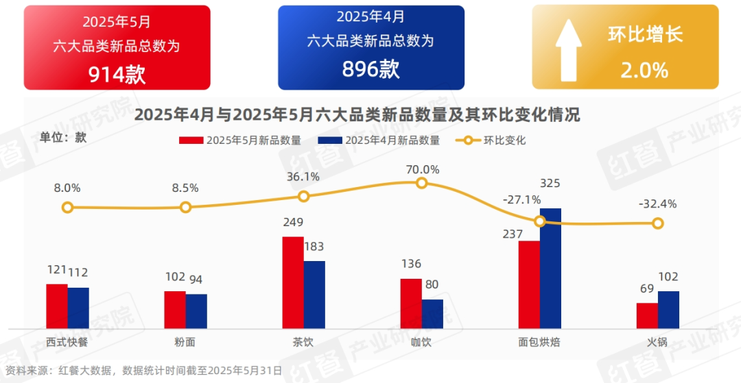 在新品数量方面,据红餐产业研究院监测,2025年5月,西式快餐、粉面、茶饮、咖饮、面包烘焙、火锅这六个品类的新品数量总共为914款,环比增幅为2%。