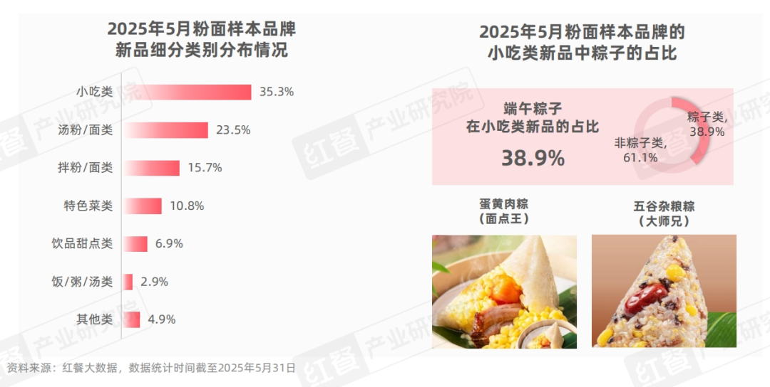 值得一提的是,在小吃类新品中,粽子类新品的占比为38.9%,这表明粉面品牌在借势端午节这一传统节日,挖掘节日特色小吃的市场潜力。