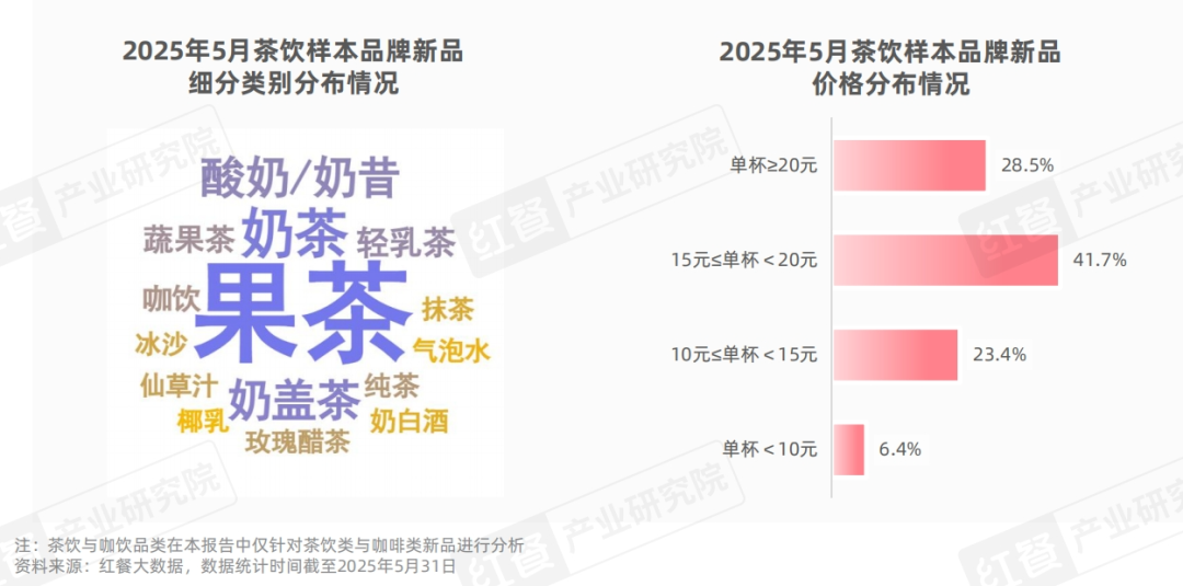 从价格分布来看,5月茶饮品牌的新品价格主要集中在15元≤单杯<20元和单杯≥20元两个区间内,占比分别为41.7%和28.5%,而10元以下和10元≤单杯<15元的茶饮新品则相对较少,占比分别为6.4%和23.4%。