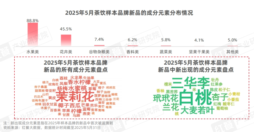 “天然、清爽、健康”的需求,茶饮品牌运用了大量的水果类元素,其次是花卉类、谷物杂粮类。具体来看,水果类成分元素中,除了草莓、芒果等经典水果和杨梅、水蜜桃等时令水果外,三华李、酸木瓜、野酸角、黄皮等极具南方地域特色的小众水果也被挖掘了出来。例如,茶百道推出了木姜子醒橄榄、木姜子香芒果等新品;苏阁鲜果茶推出了云南夏甜·杨梅蜜桃、云南夏甜·杨梅冰等新品。