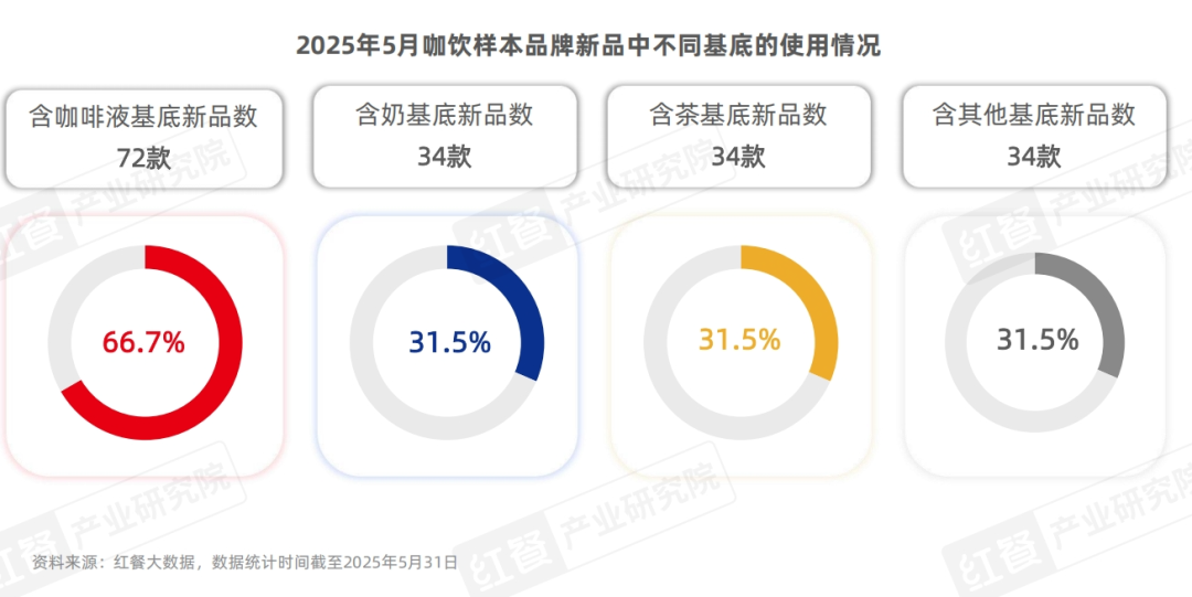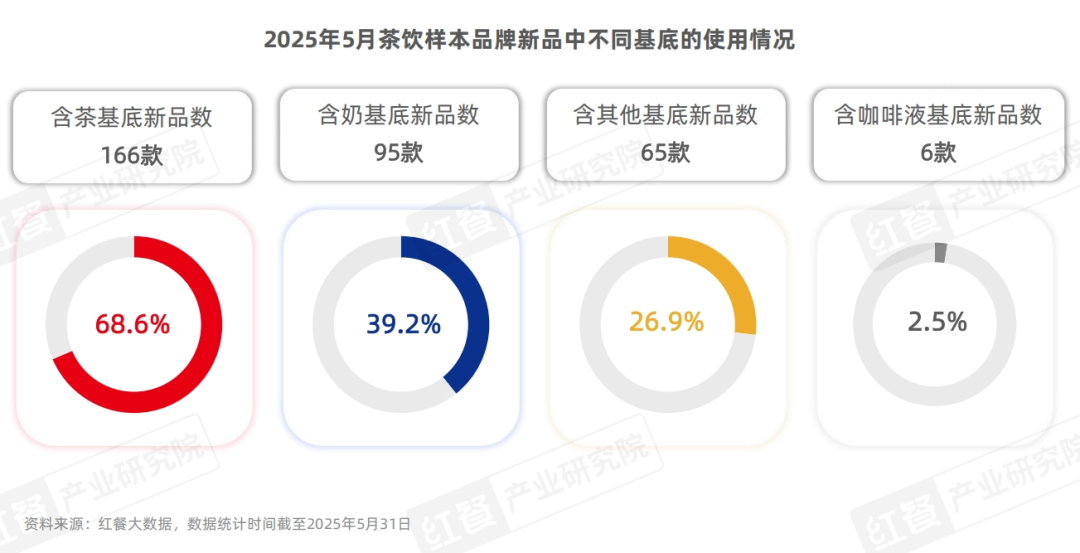 从茶饮类和咖啡类新品使用的基底来看,含茶基底的新品数达166款,占比为68.6%;其次,含奶基底的新品和含其他基底的新品也较多,分别有95款和65款,占比分别为39.2%、26.9%;而含咖啡液基底的新品最少,占比仅有2.5%。值得关注的是,相较于2025年4月,气泡水、果汁、盐水等具有清爽感的基底开始被大量运用到新品中。![]()