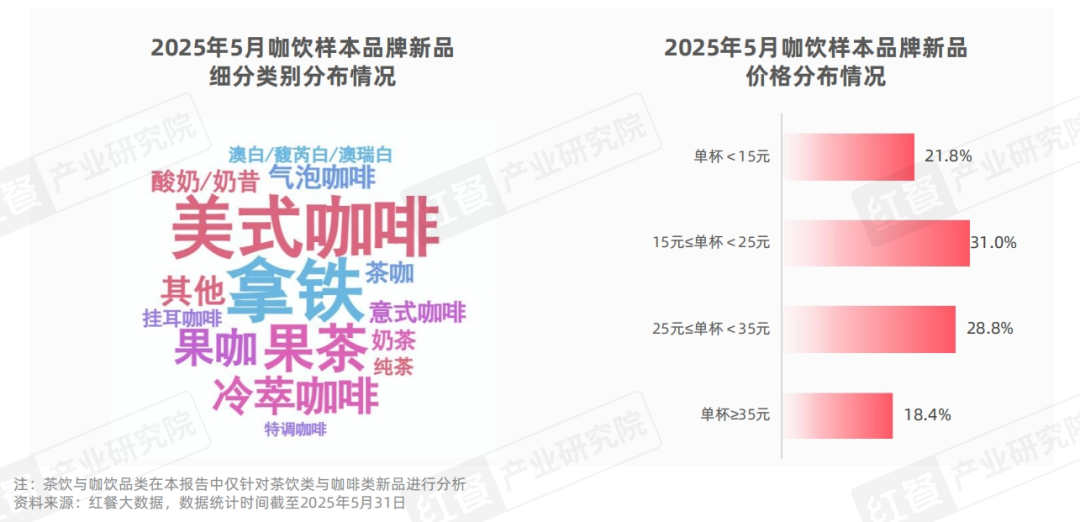 从价格分布来看,当月茶饮类和咖啡类新品价格分布主要集中在15元≤单杯<25元和25元≤单杯<35元两个区间内,占比分别为31%和28.8%,单杯在15元以下的新品占比为21.8%,相比之下,单杯在35元及以上的新品占比较少,仅为18.4%。