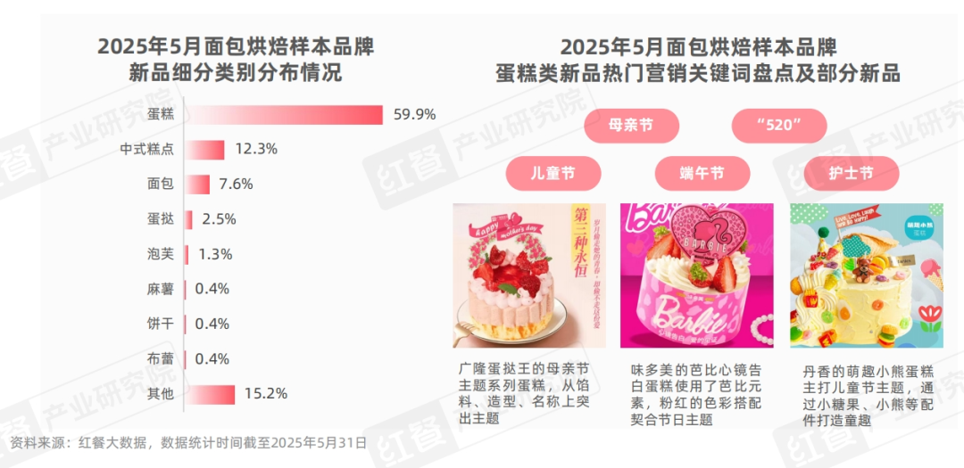 2025年5月,从面包烘焙品类新品的细分类别来看,蛋糕类新品数量最多,共推出了142款,占新品总数的59.9%,中式糕点、面包等类别的新品占比较低。其中,蛋糕类新品的主题主要聚焦在母亲节、“520”、儿童节、端午节等节日,围绕“情感共鸣+健康升级+趣味体验”三大维度创新。例如,广隆蛋挞王推出了第三种永恒、爱不等待等母亲节主题系列蛋糕;巴莉甜甜推出了告白玫瑰、满杯爱意等“520”主题蛋糕。